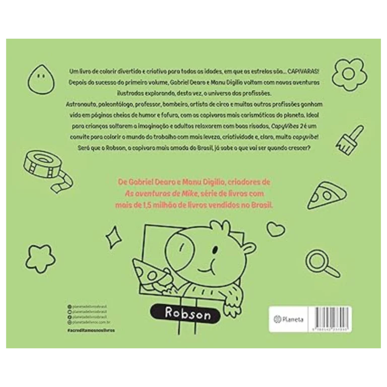 Depois do sucesso do primeiro volume, Gabriel Dearo e Manu Digilio voltam com novas aventuras ilustradas explorando, desta vez, o universo das profissões. Astronauta, paleontólogo, professor, bombeiro, artista de circo e muitas outras profissões ganham vida em páginas cheias de humor e fofura, com as capivaras mais carismáticas do planeta.